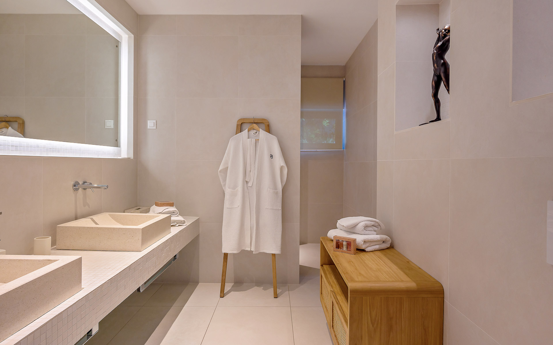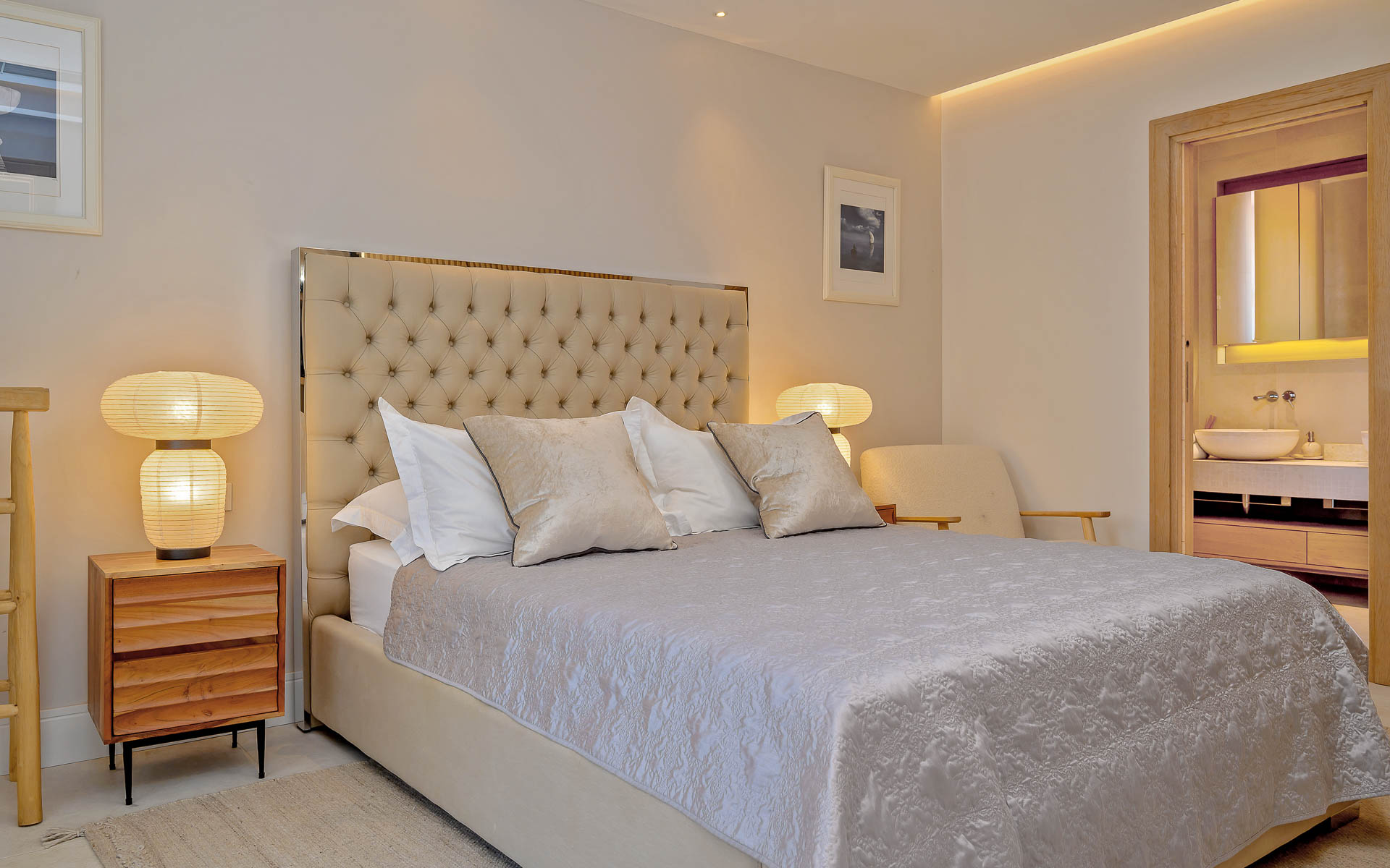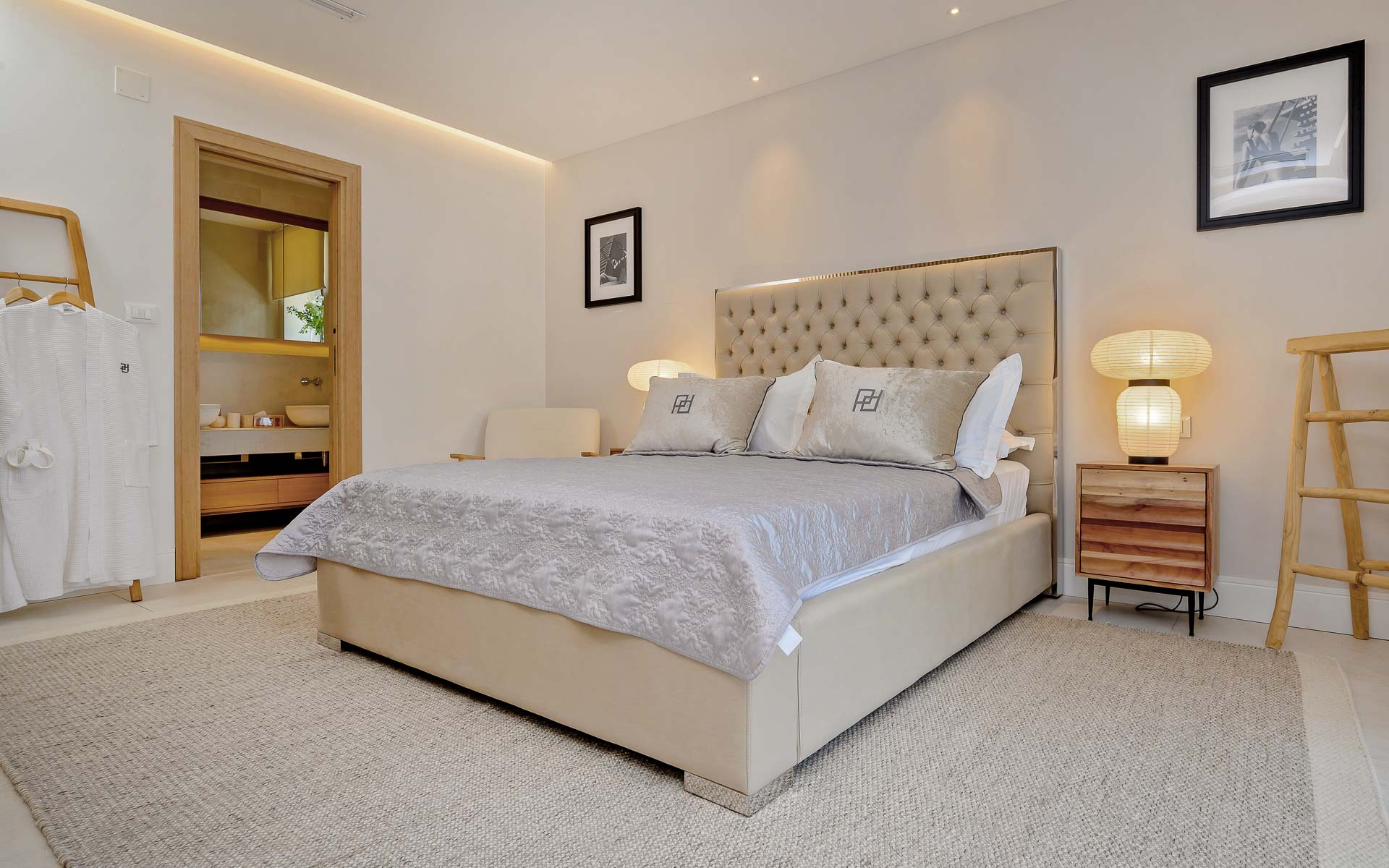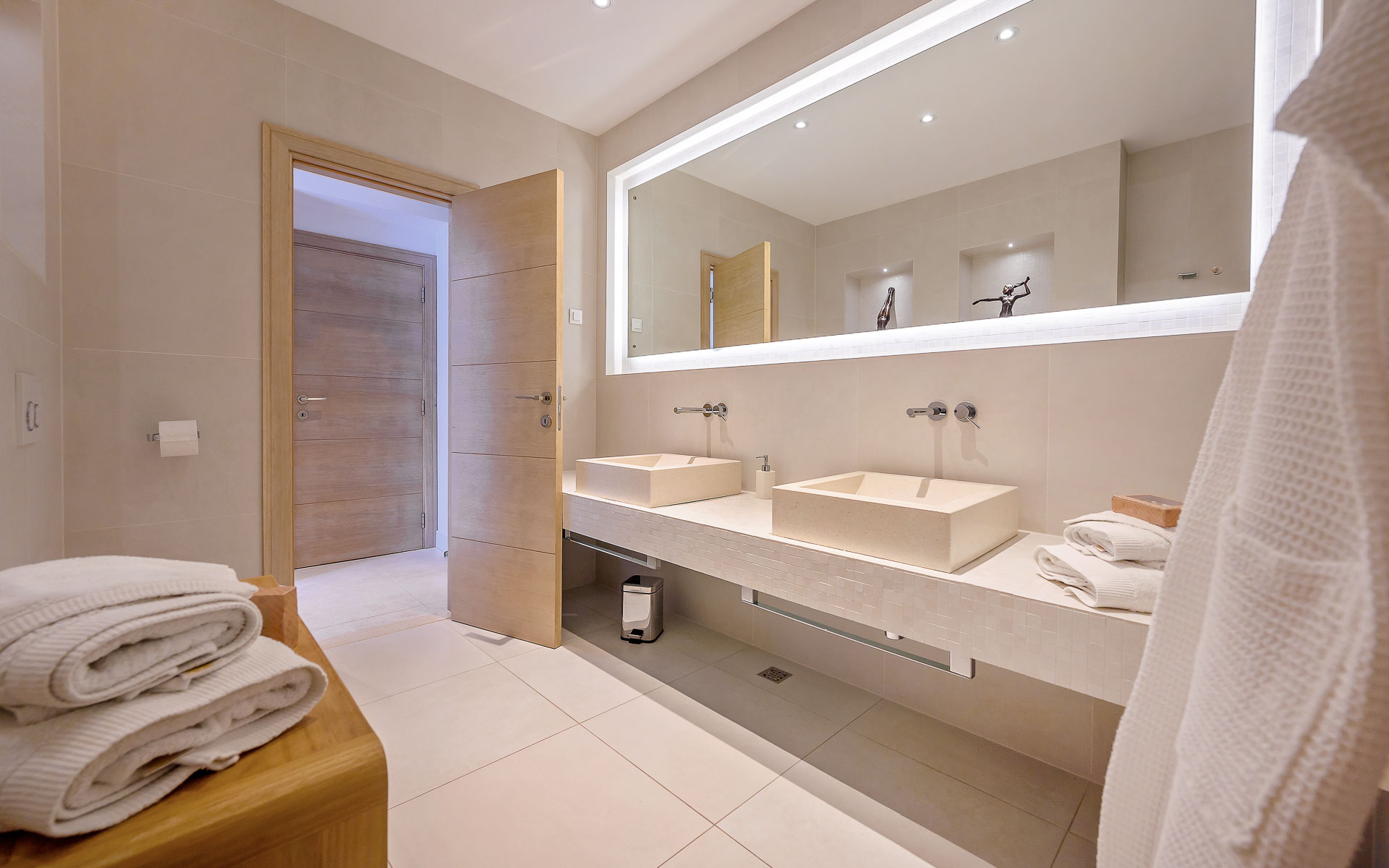 Entrance Level – The two master suits can be found off the main entrance hall. Both benefit from full height glass windows giving access to the stunning sea and mountain views. Blackout curtains open to let sunbeams flood the room with warm light. The beds themselves are king size and benefit from Egyptian cotton linens. Opposite the bed, the TV screen is linked to the central satellite. Both bedrooms have large private balconies with their own seating area allowing guests to take breakfast or just to escape to their own private domain. The bathrooms are a sublime exercise in understated opulence.