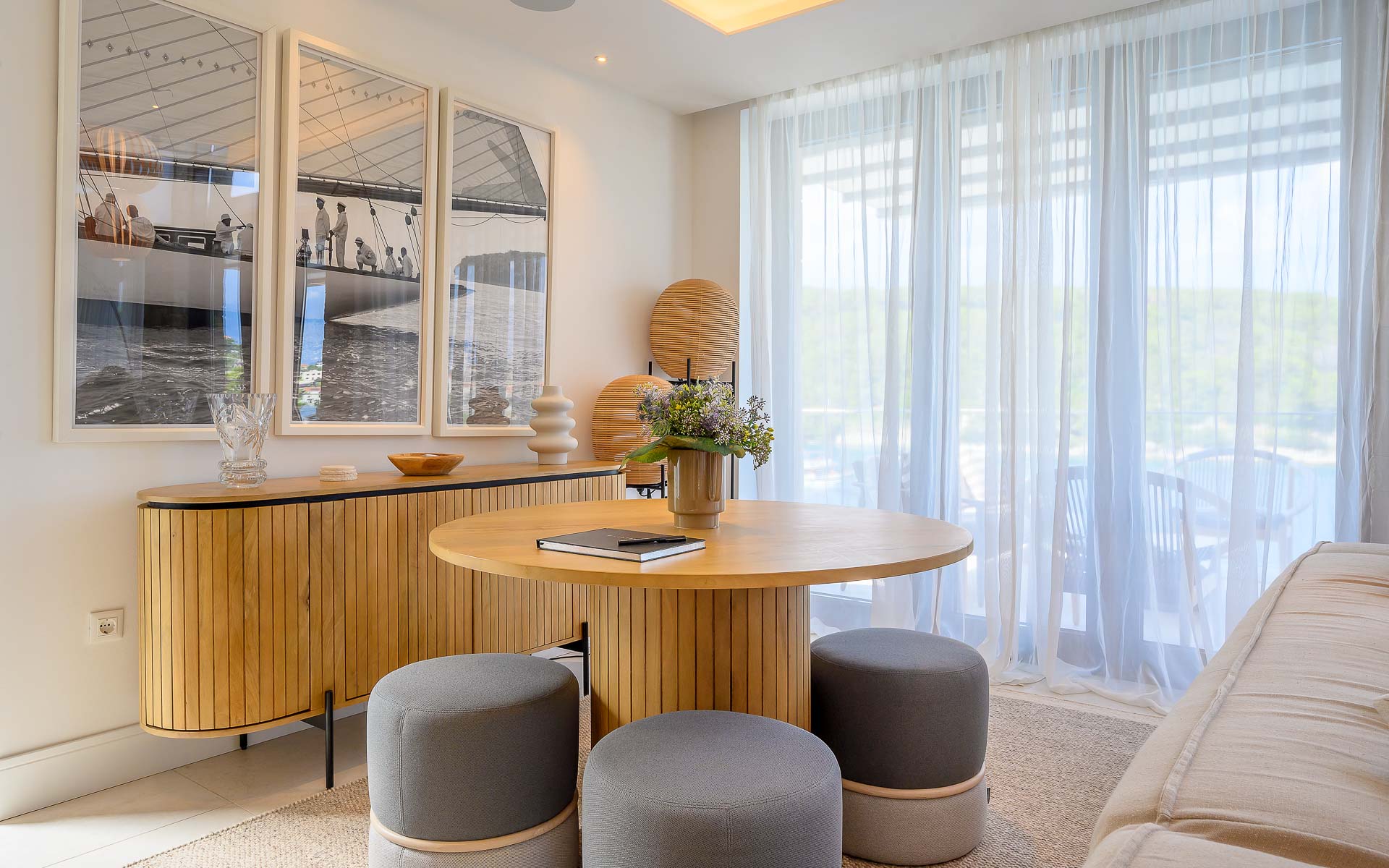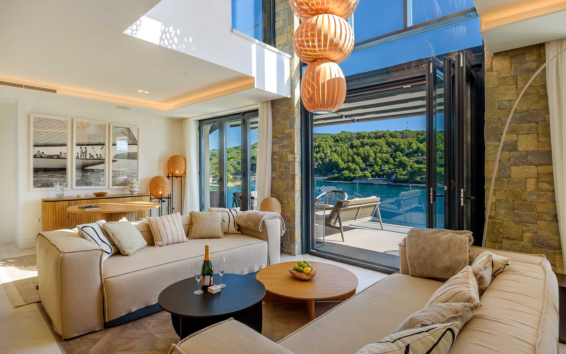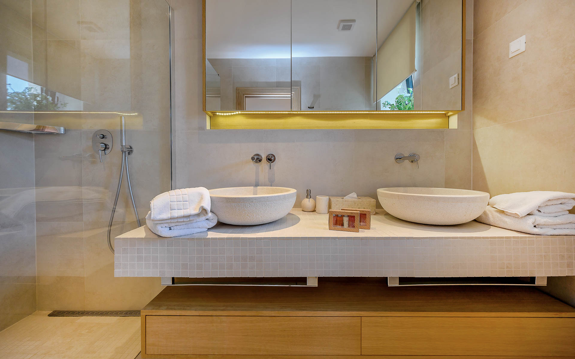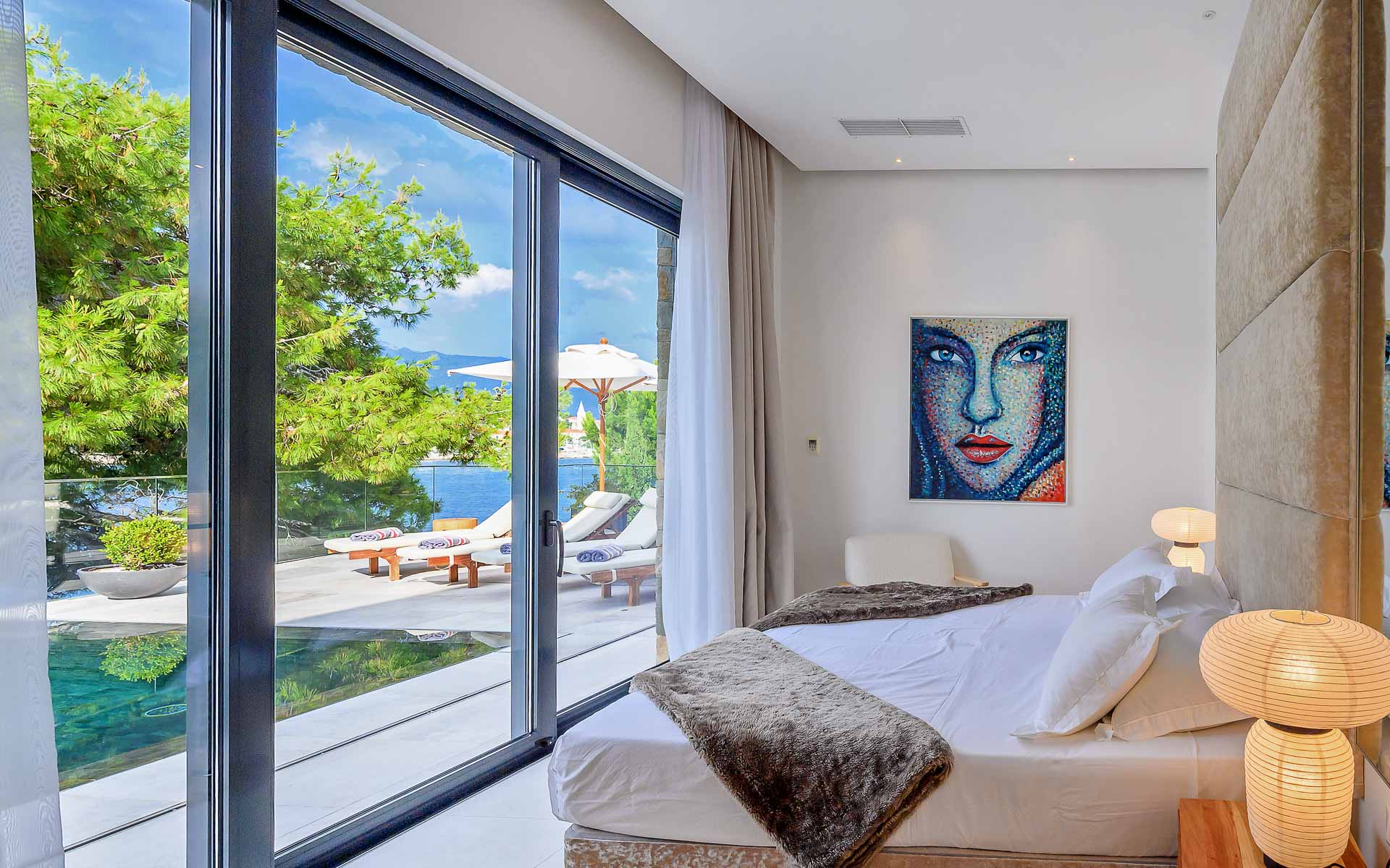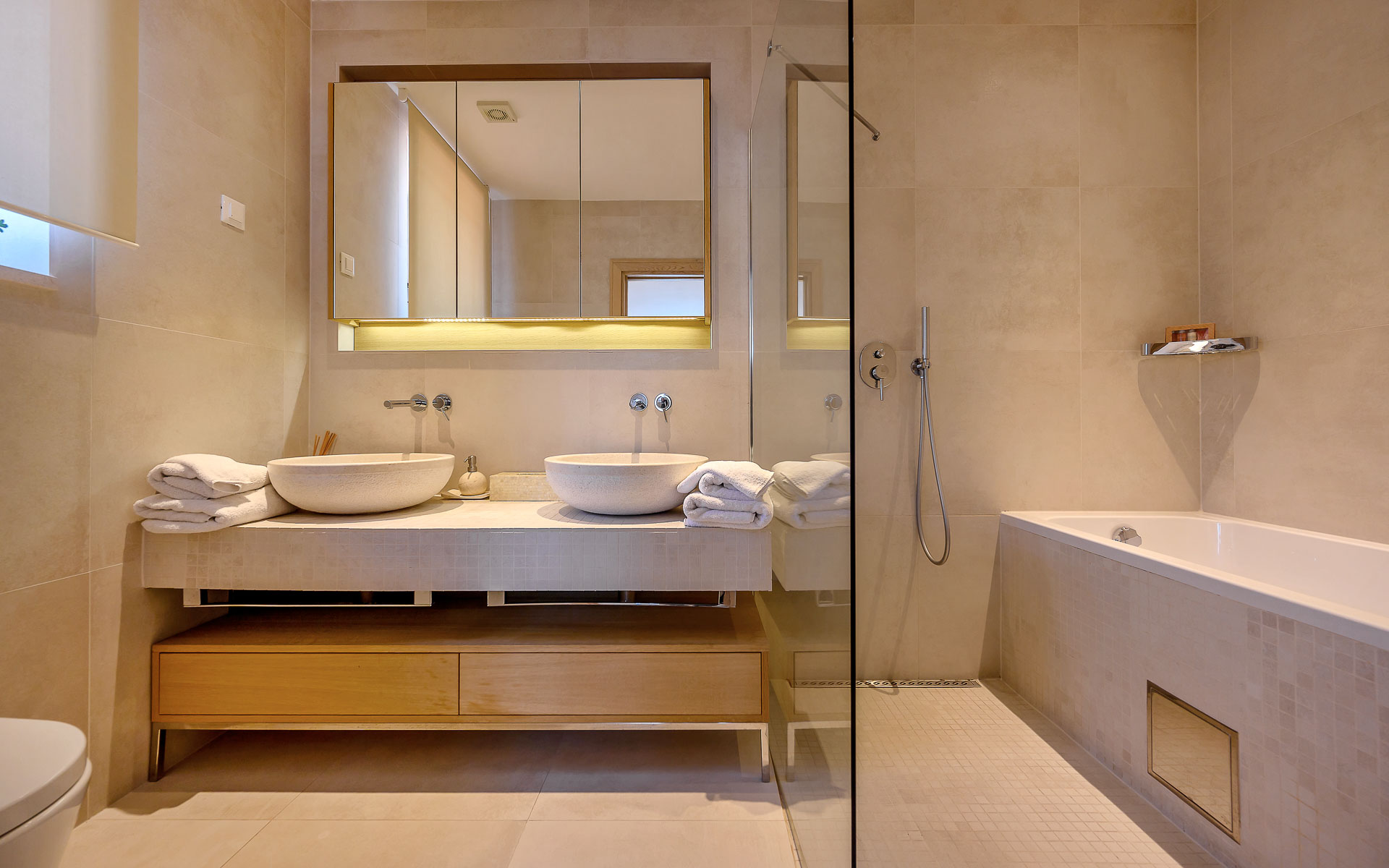 Entrance Level – The two master suits can be found off the main entrance hall. Both benefit from full height glass windows giving access to the stunning sea and mountain views. Blackout curtains open to let sunbeams flood the room with warm light. The beds themselves are king size and benefit from Egyptian cotton linens. Opposite the bed, the TV screen is linked to the central satellite. Both bedrooms have large private balconies with their own seating area allowing guests to take breakfast or just to escape to their own private domain. The bathrooms are a sublime exercise in understated opulence.