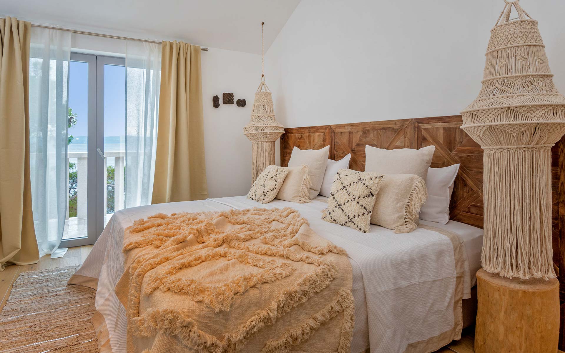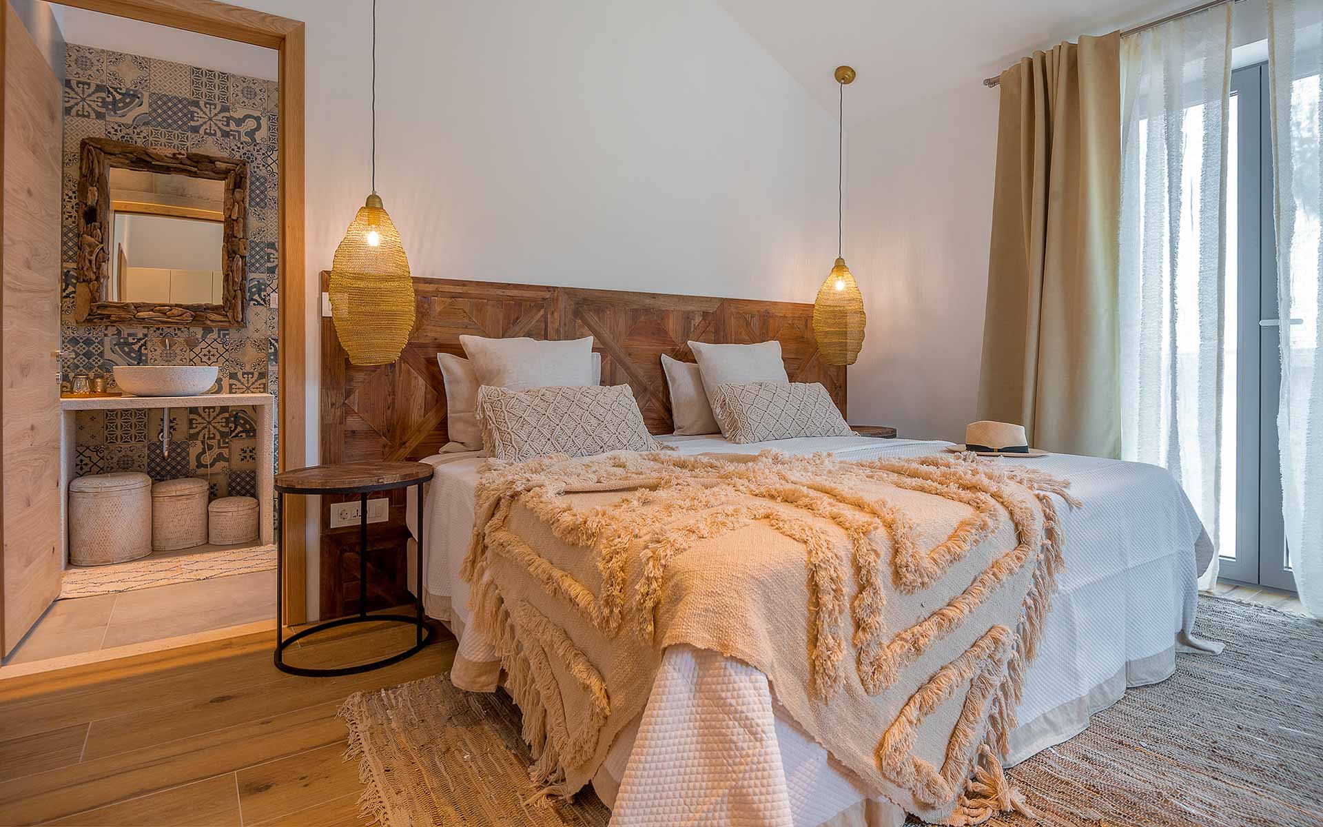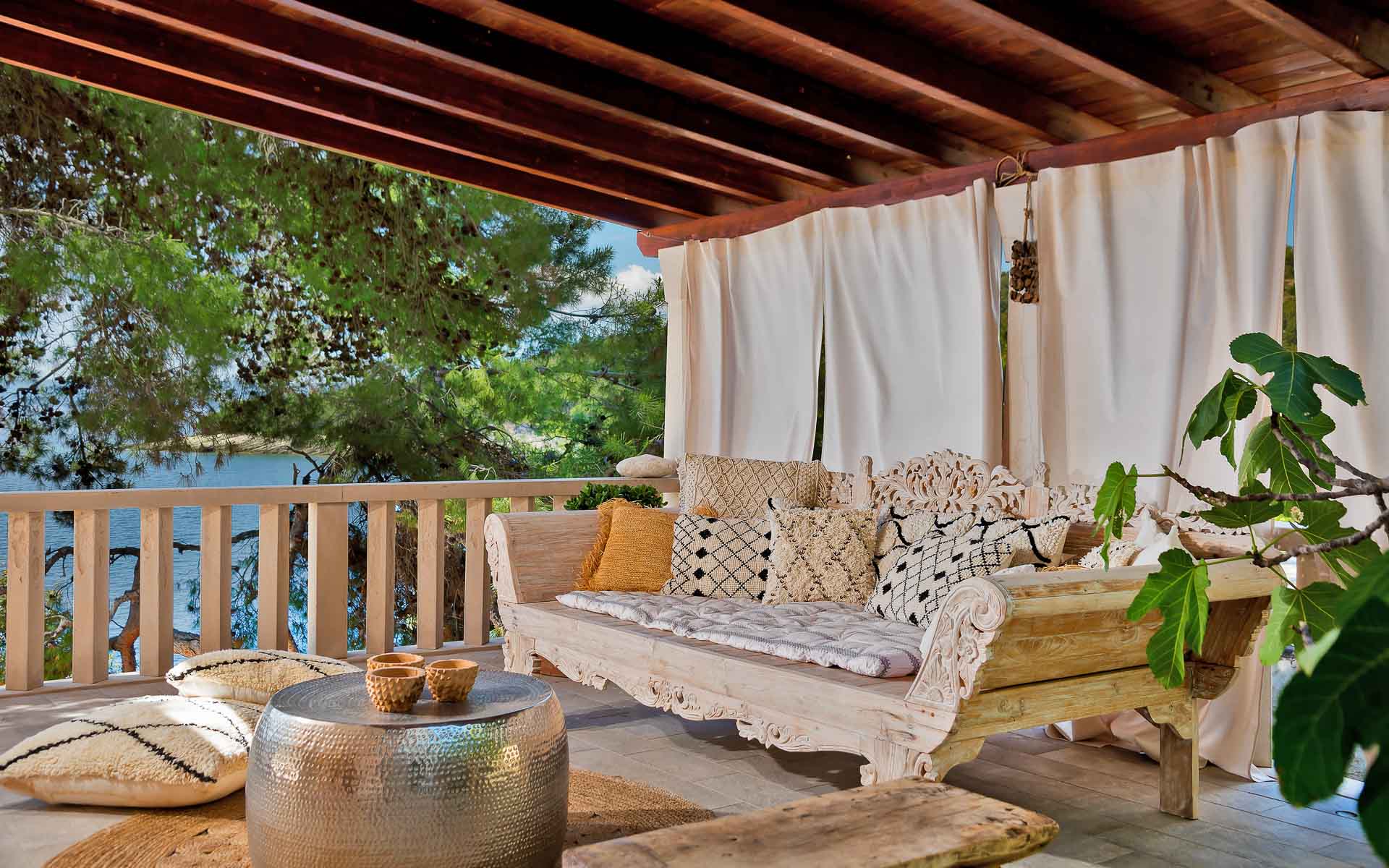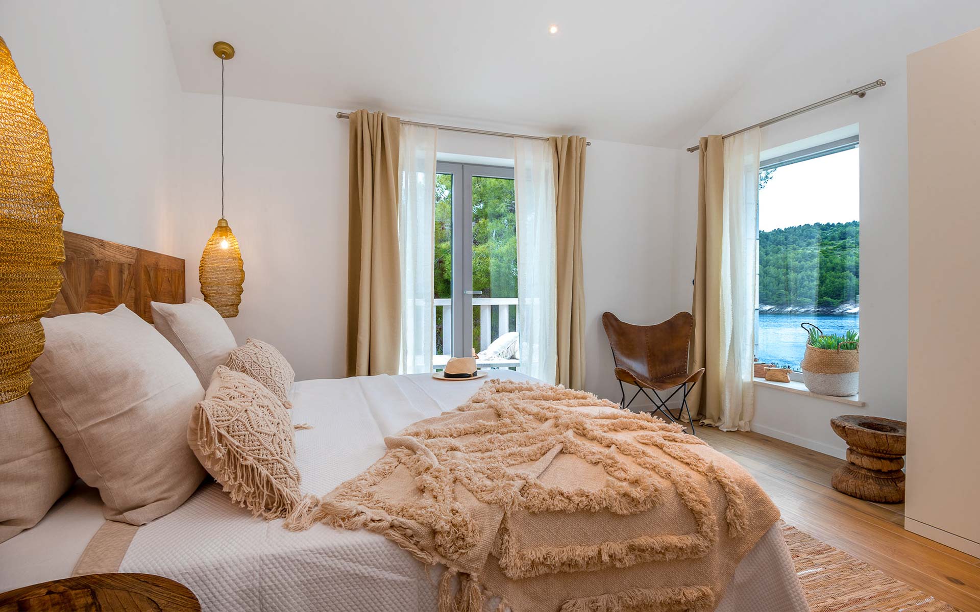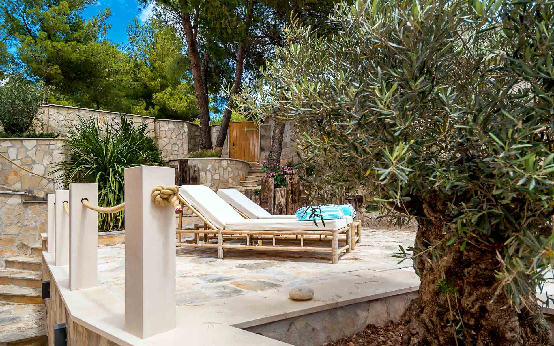 The open-plan interior is stylishly furnished with handcrafted pieces and natural materials, while the outdoor areas are designed for all-day relaxation—complete with an infinity pool, sea platform, hammocks, and shaded lounges. A landscaped Mediterranean garden leads to a private swimming platform with direct sea access.