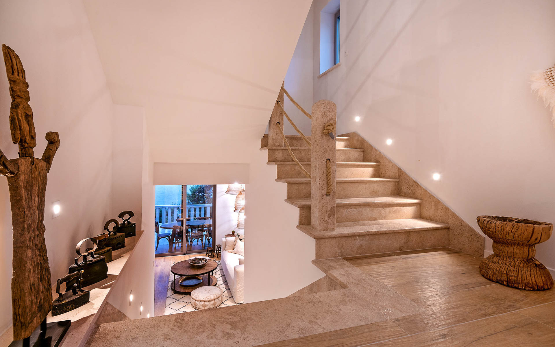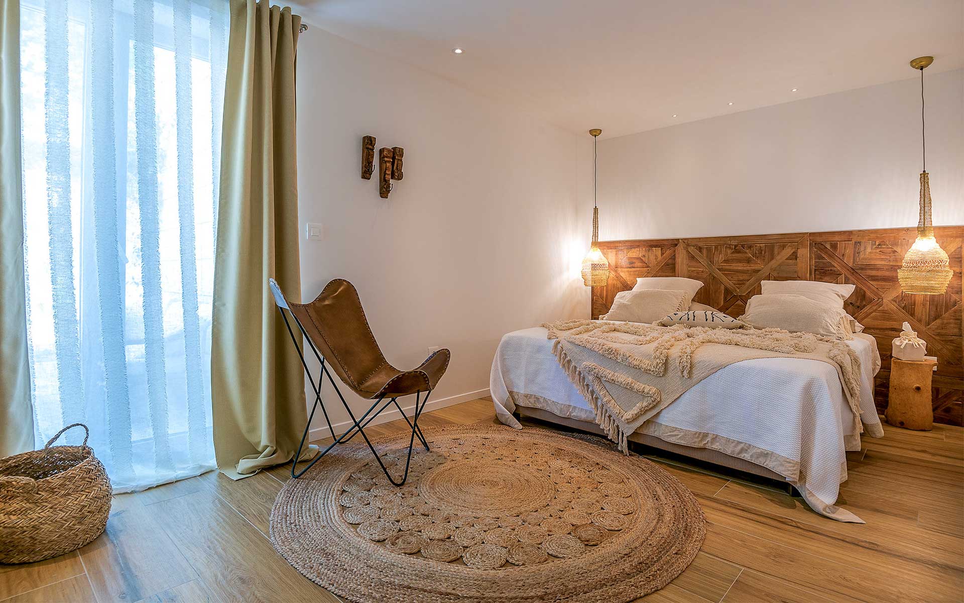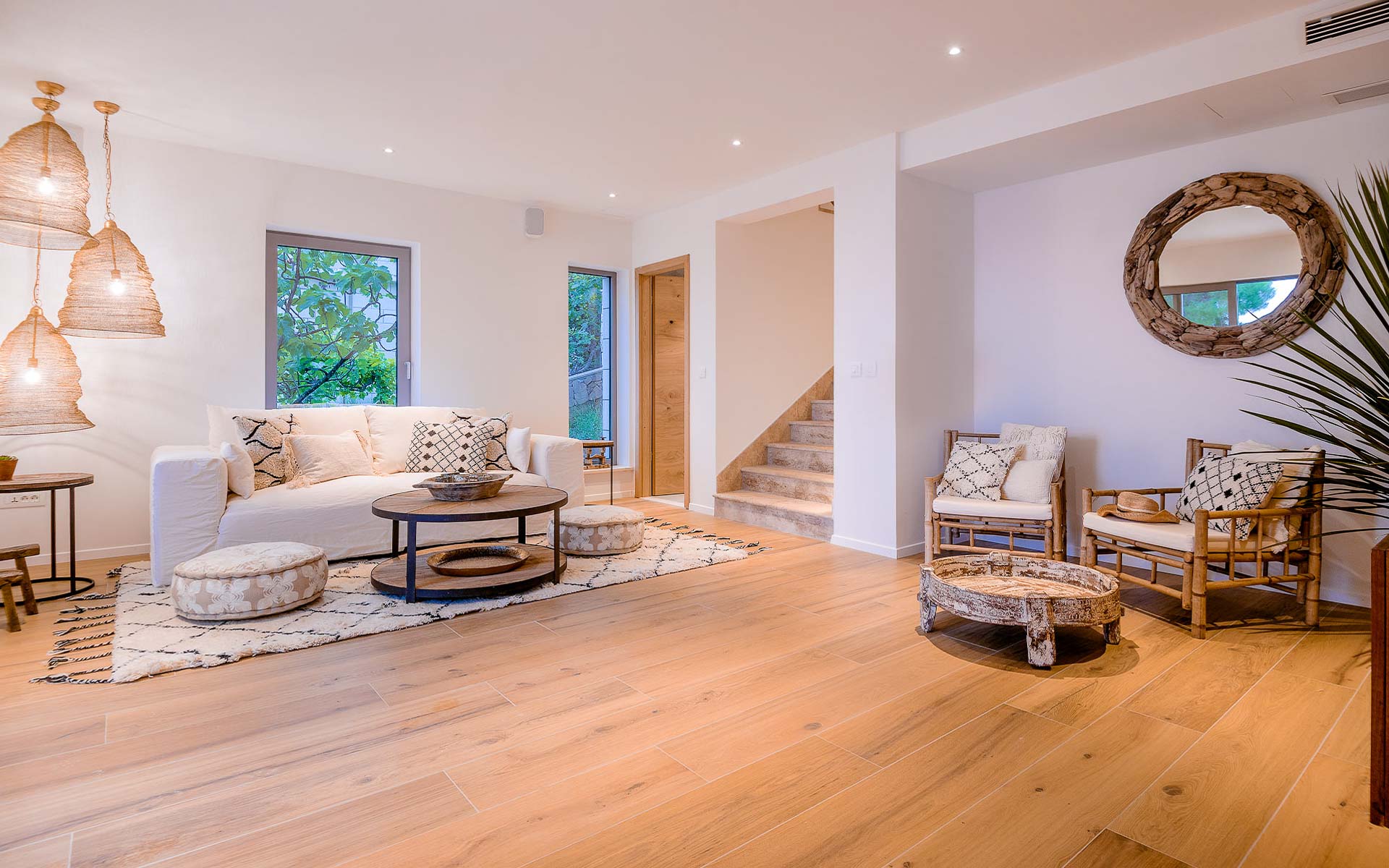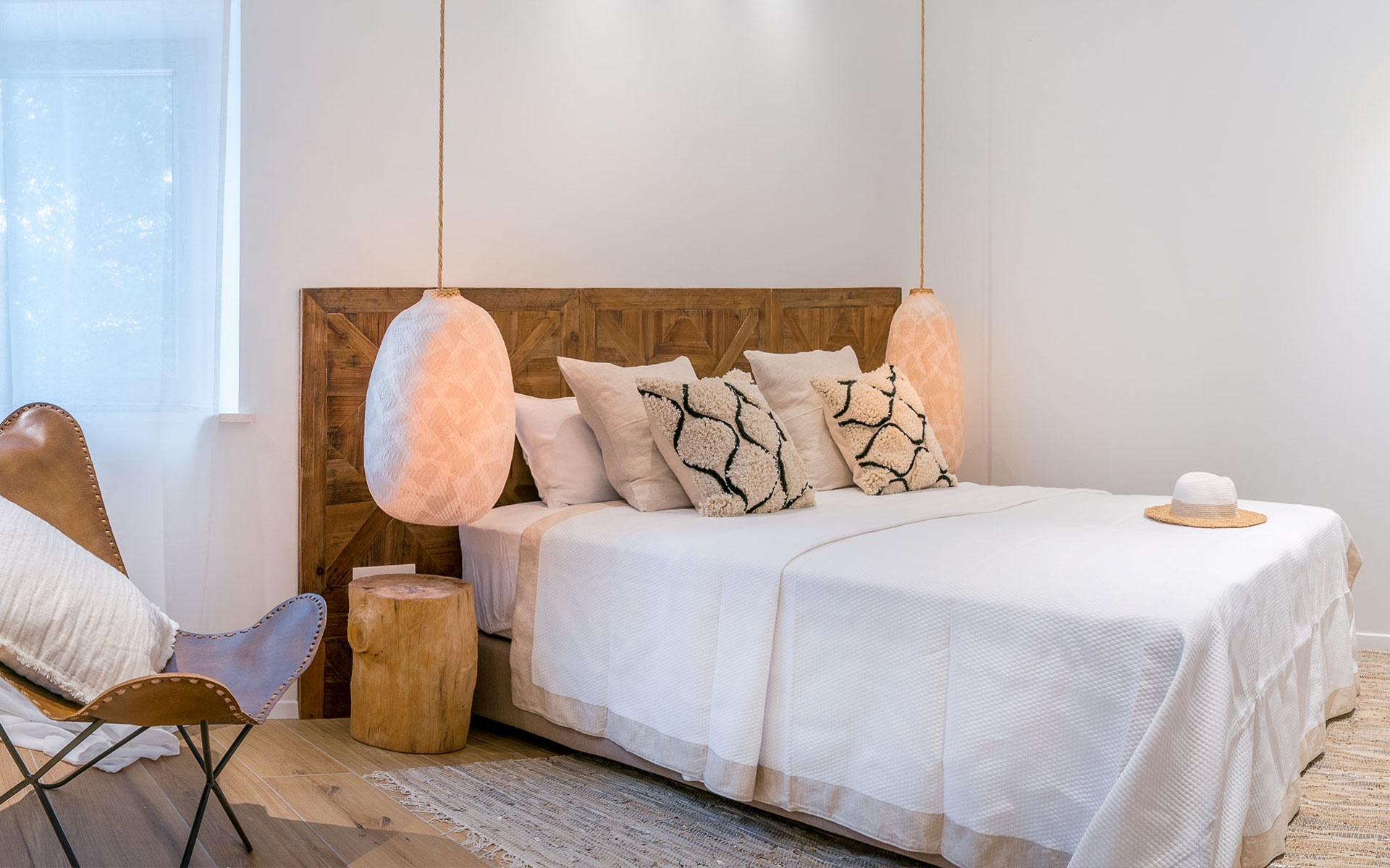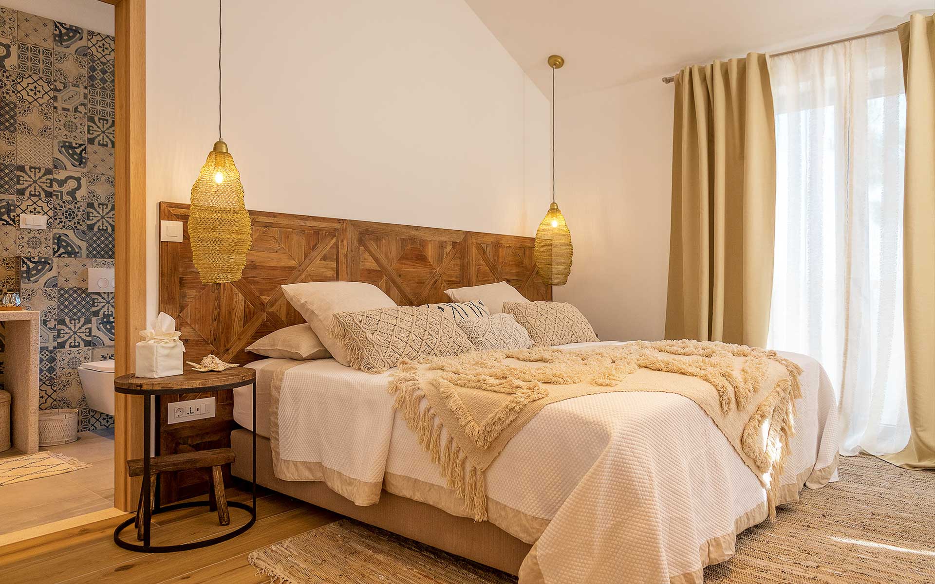 The open-plan interior is stylishly furnished with handcrafted pieces and natural materials, while the outdoor areas are designed for all-day relaxation—complete with an infinity pool, sea platform, hammocks, and shaded lounges. A landscaped Mediterranean garden leads to a private swimming platform with direct sea access.