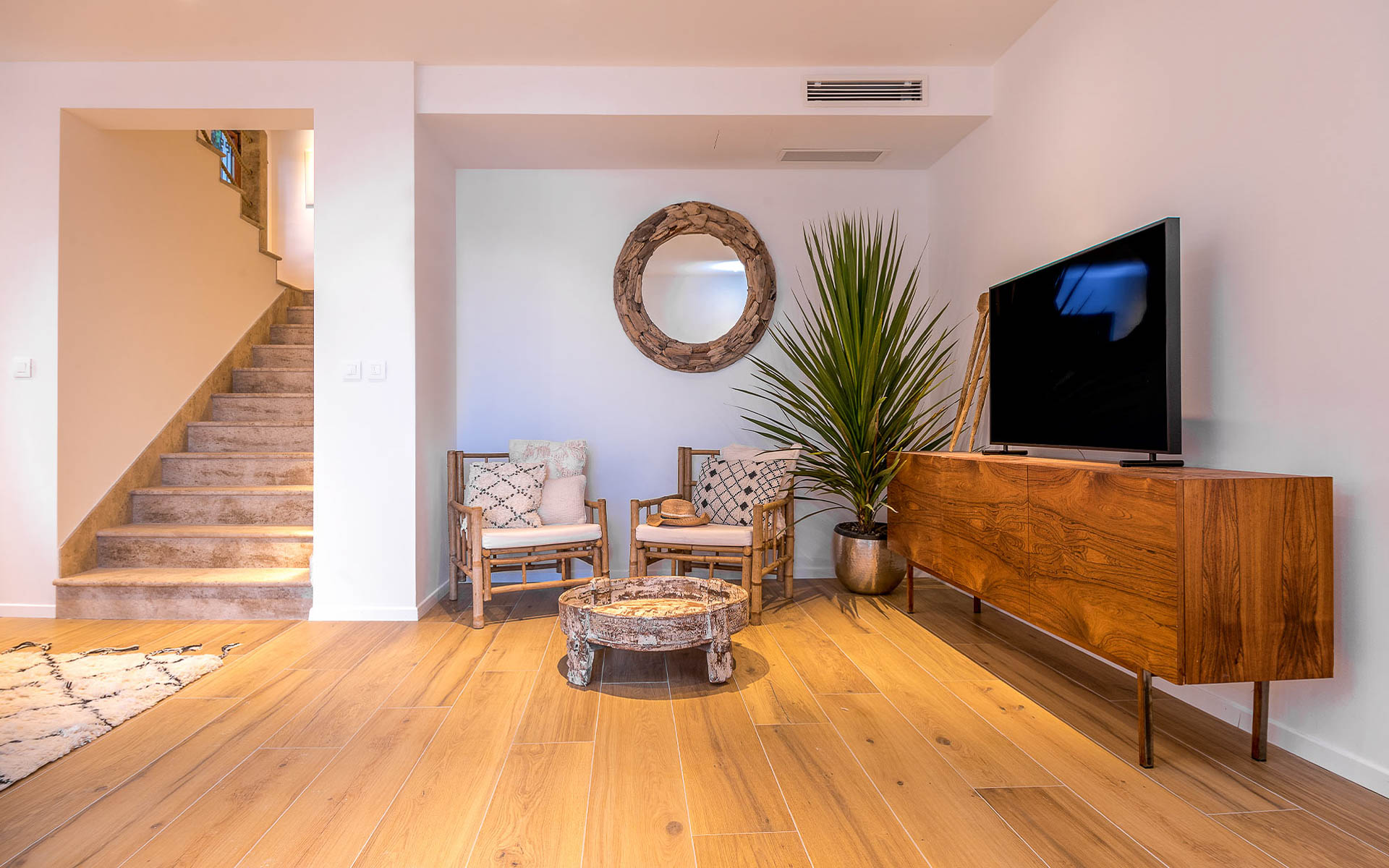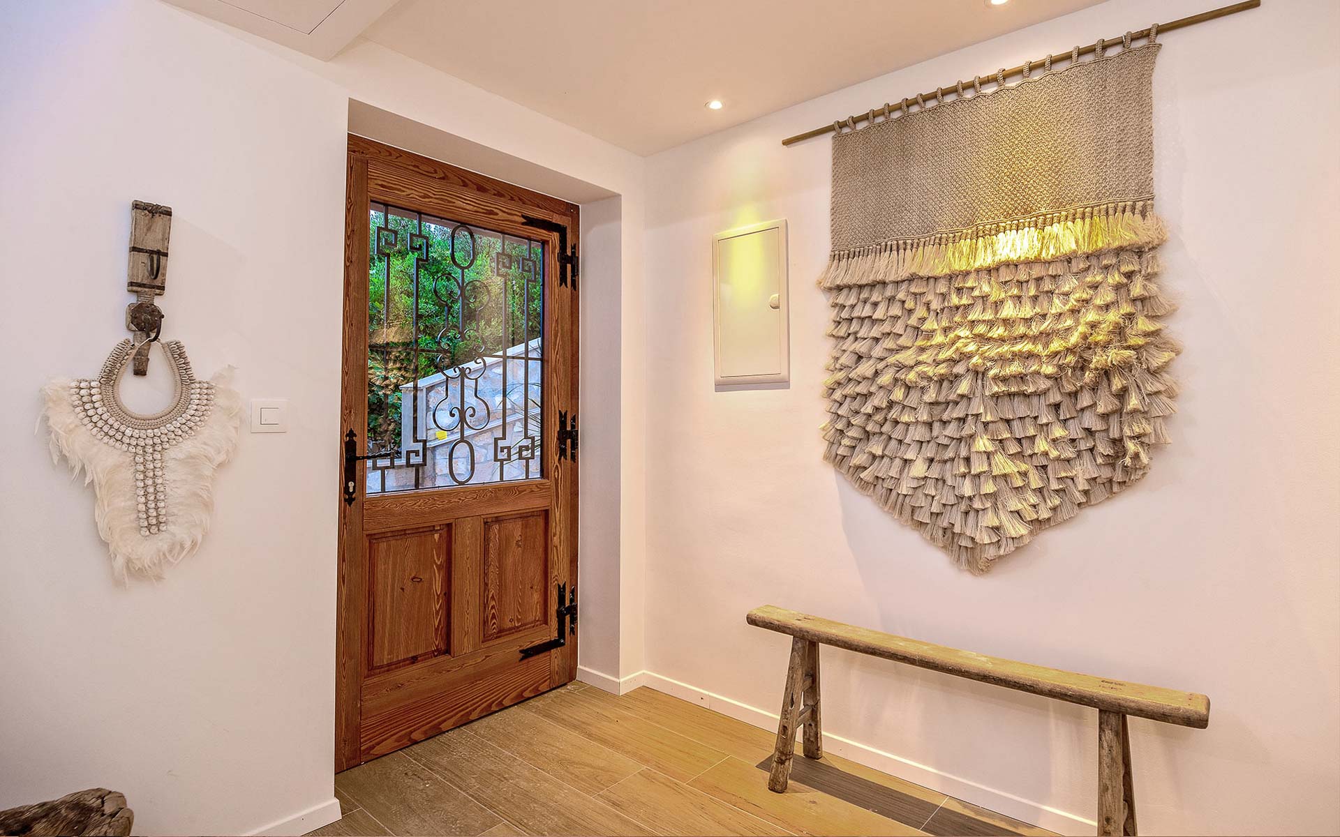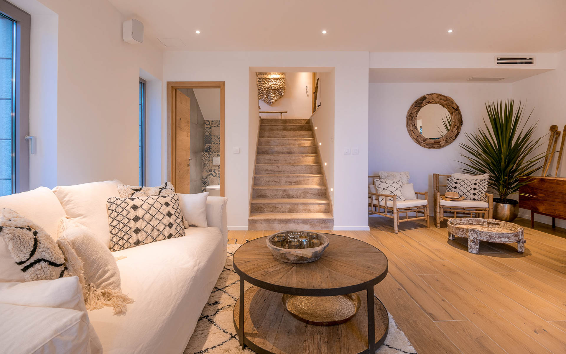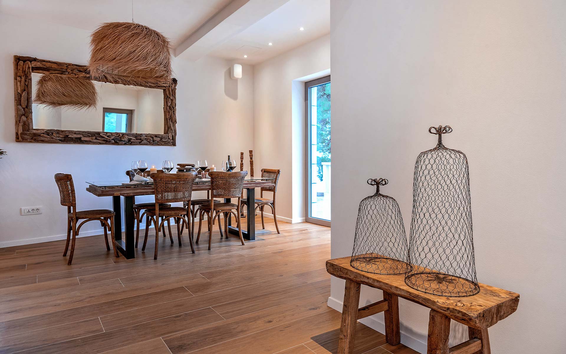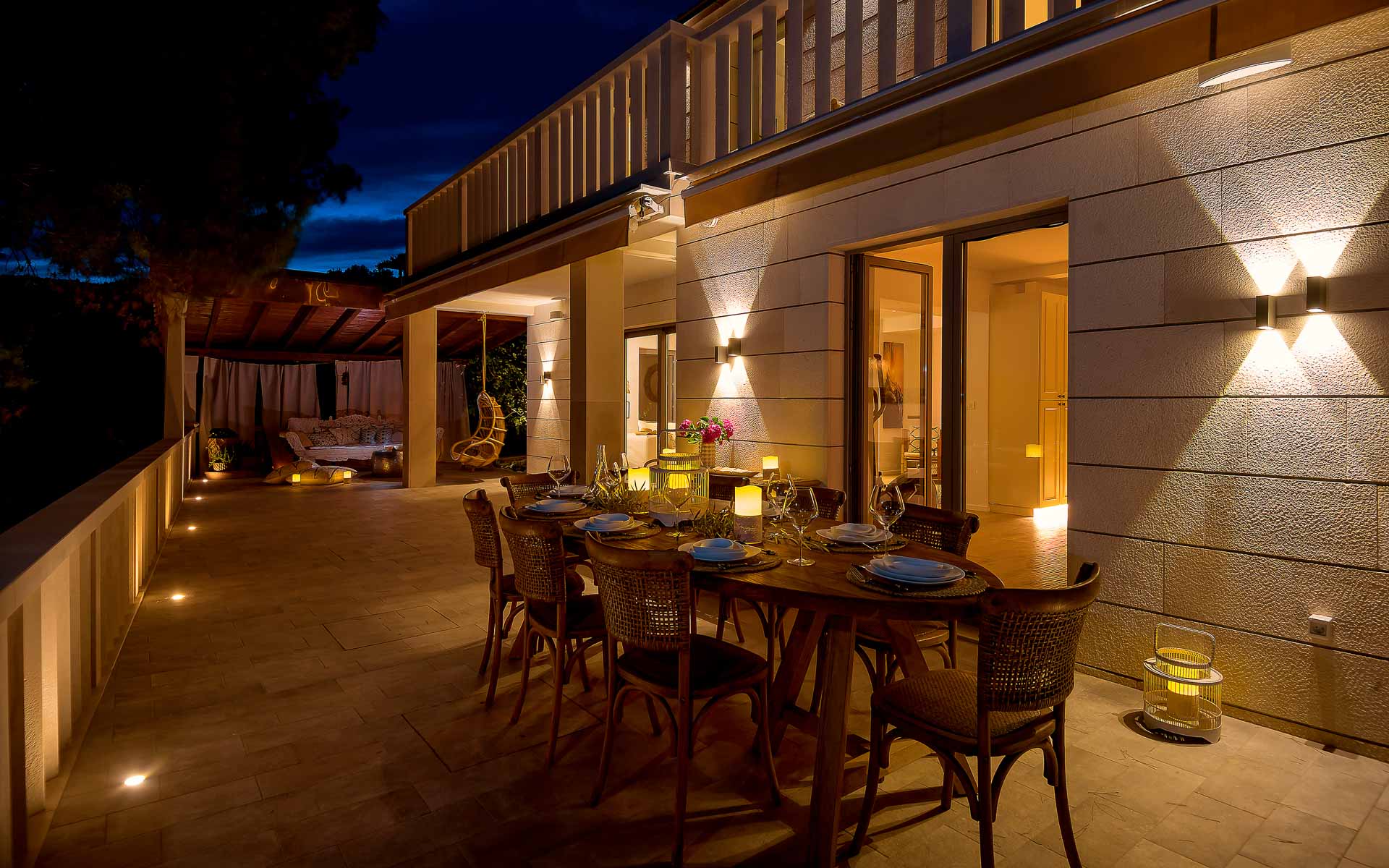 The open-plan interior is stylishly furnished with handcrafted pieces and natural materials, while the outdoor areas are designed for all-day relaxation—complete with an infinity pool, sea platform, hammocks, and shaded lounges. A landscaped Mediterranean garden leads to a private swimming platform with direct sea access.