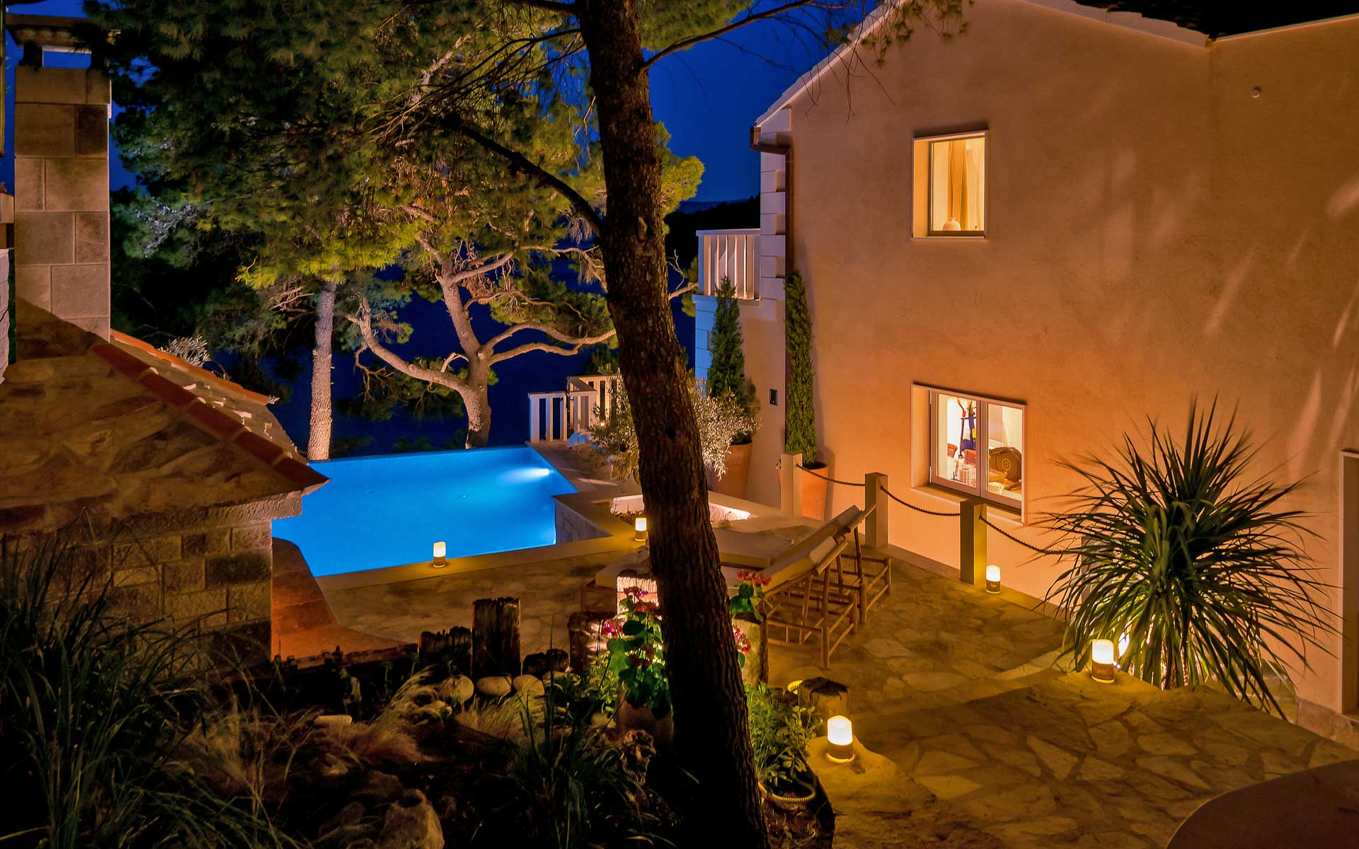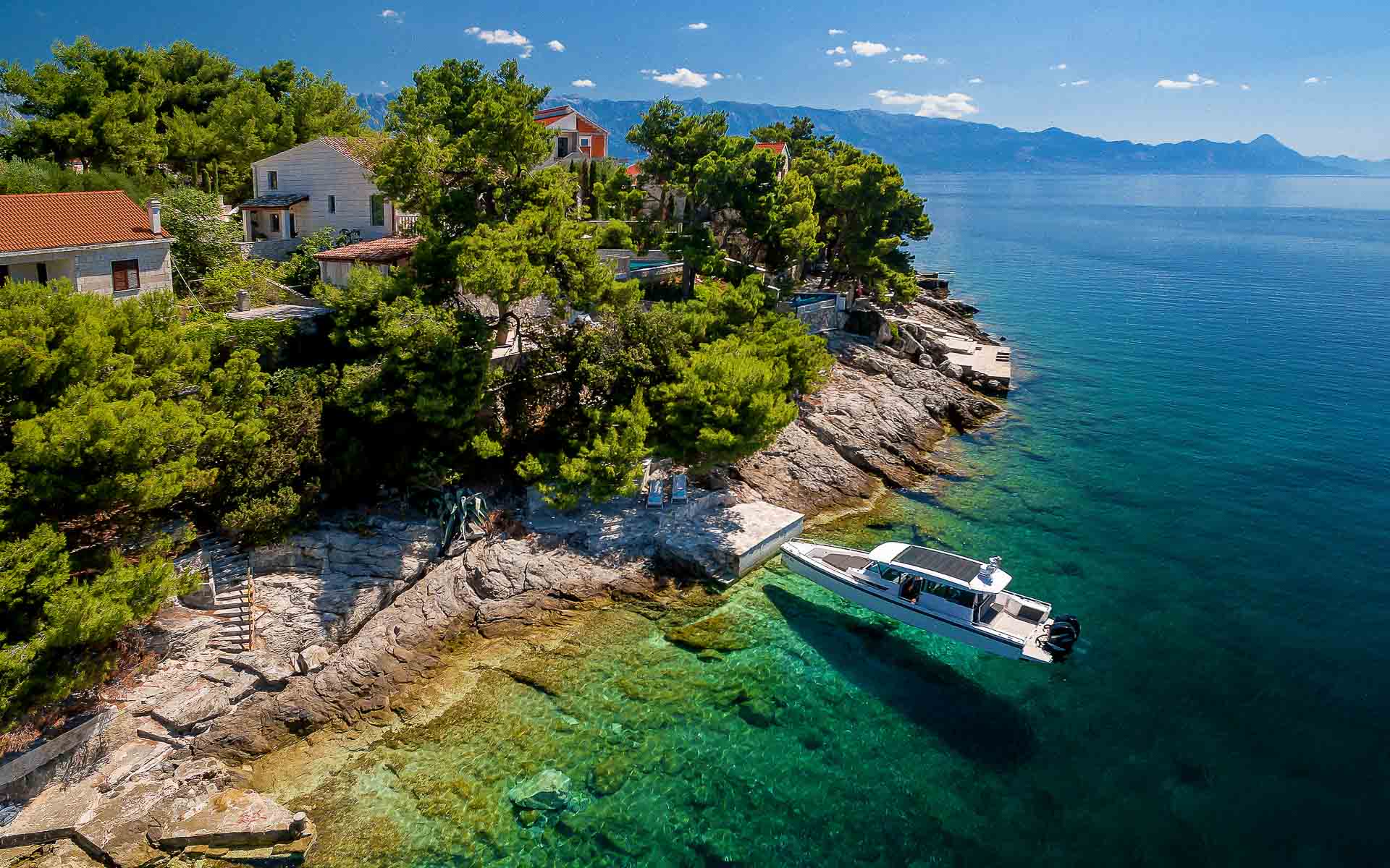 Tucked into a peaceful cove near Sumartin, Villa Mala is a beachfront retreat offering understated luxury and total privacy. Surrounded by pine trees and steps from the crystal-clear sea, this stunning stone villa features four spacious double bedrooms (with super king-size beds that can convert into twins), each with an en-suite bathroom and sea views through the trees.