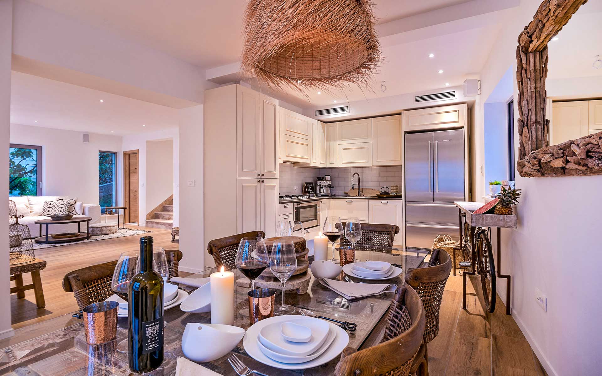 Kayaks, paddle boards, and bikes are provided free of charge, and a daily cleaning service is included. A private chef can be arranged on request.