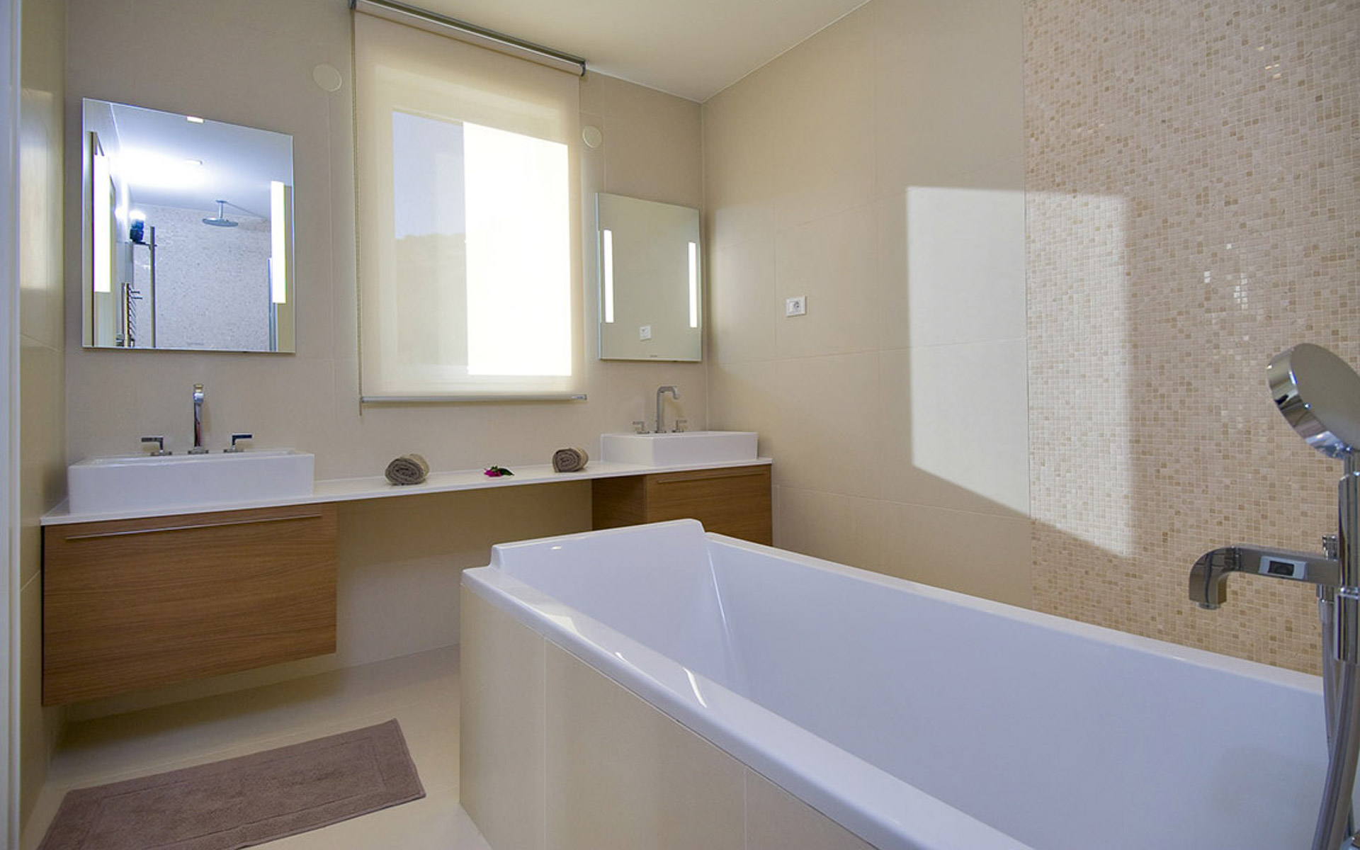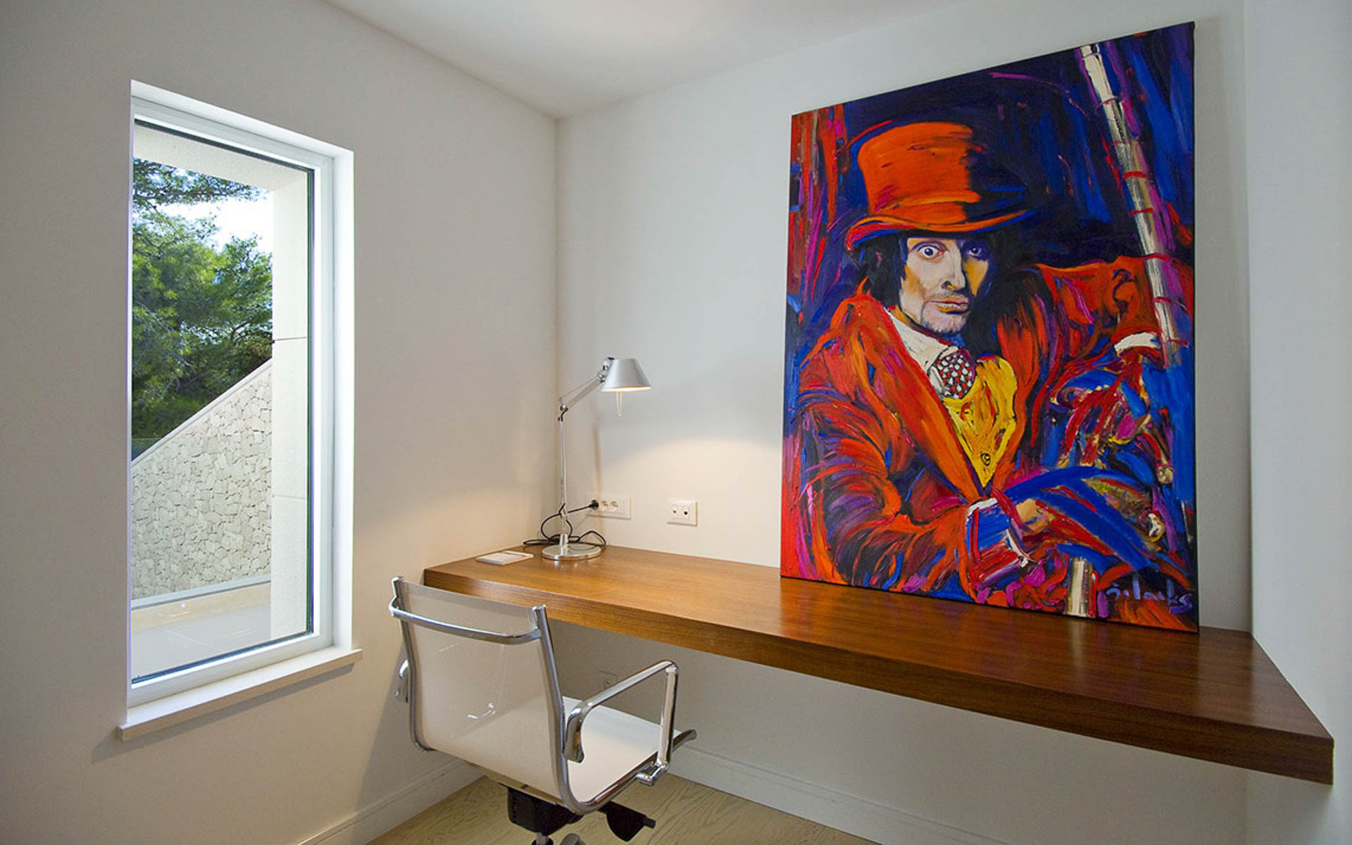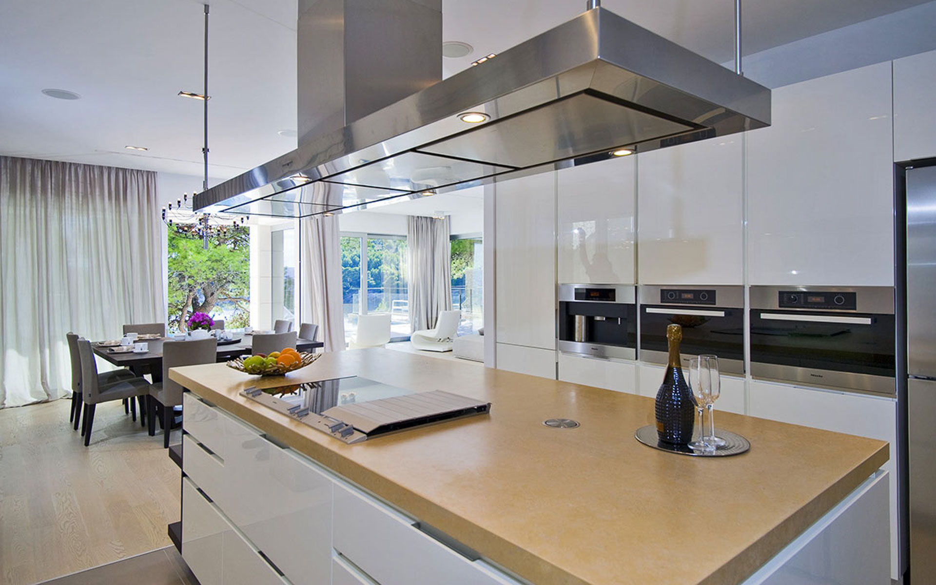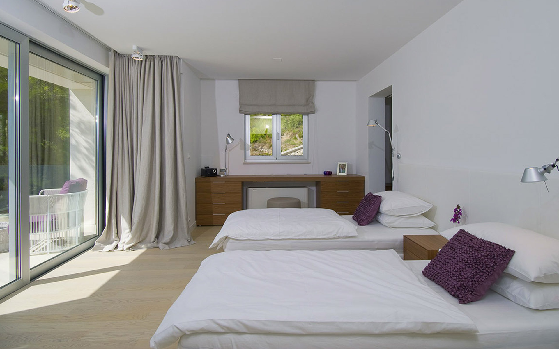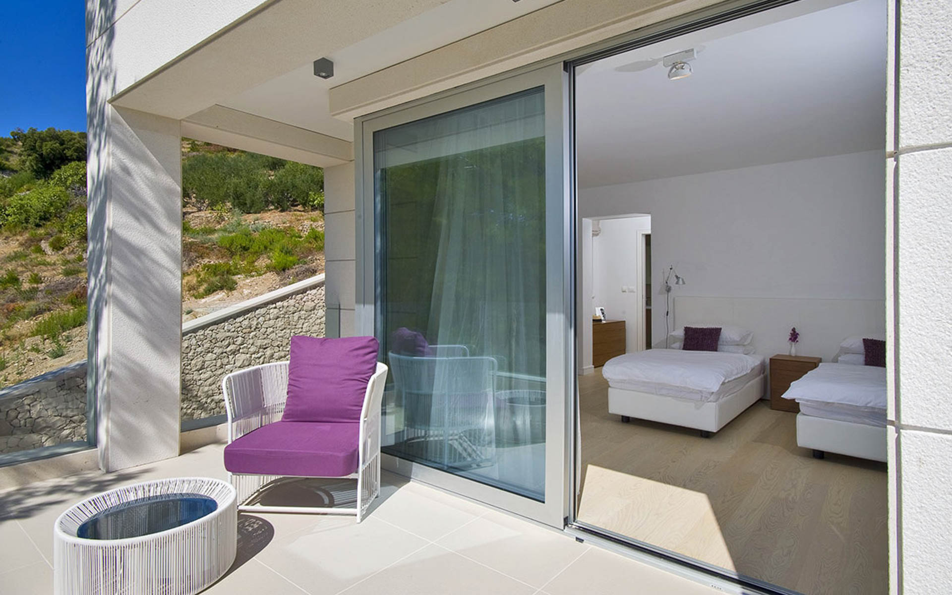 Inside, Villa Tiha is airy and modern, with open-plan living spaces and floor-to-ceiling glass doors that bring the outside in. The first floor offers two spacious en-suite bedrooms, each with private terraces, spa baths, and walk-in wardrobes. The top-floor master suite is a standout, with stunning sea views, while the fourth bedroom provides flexibility for guests or staff.