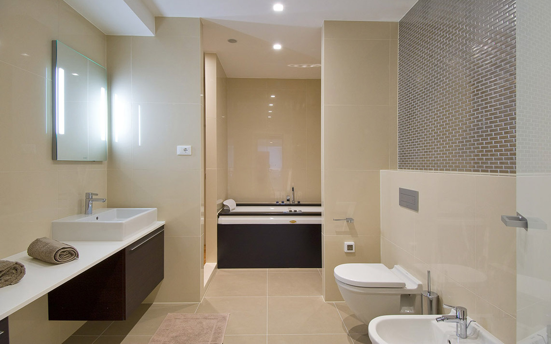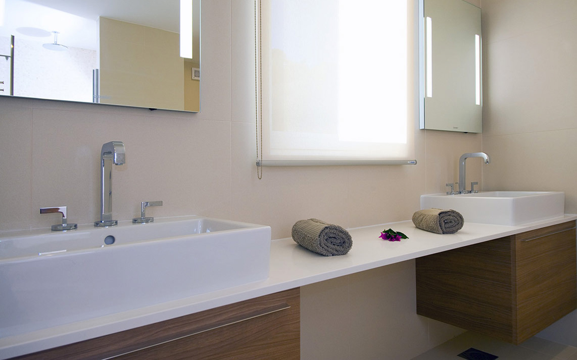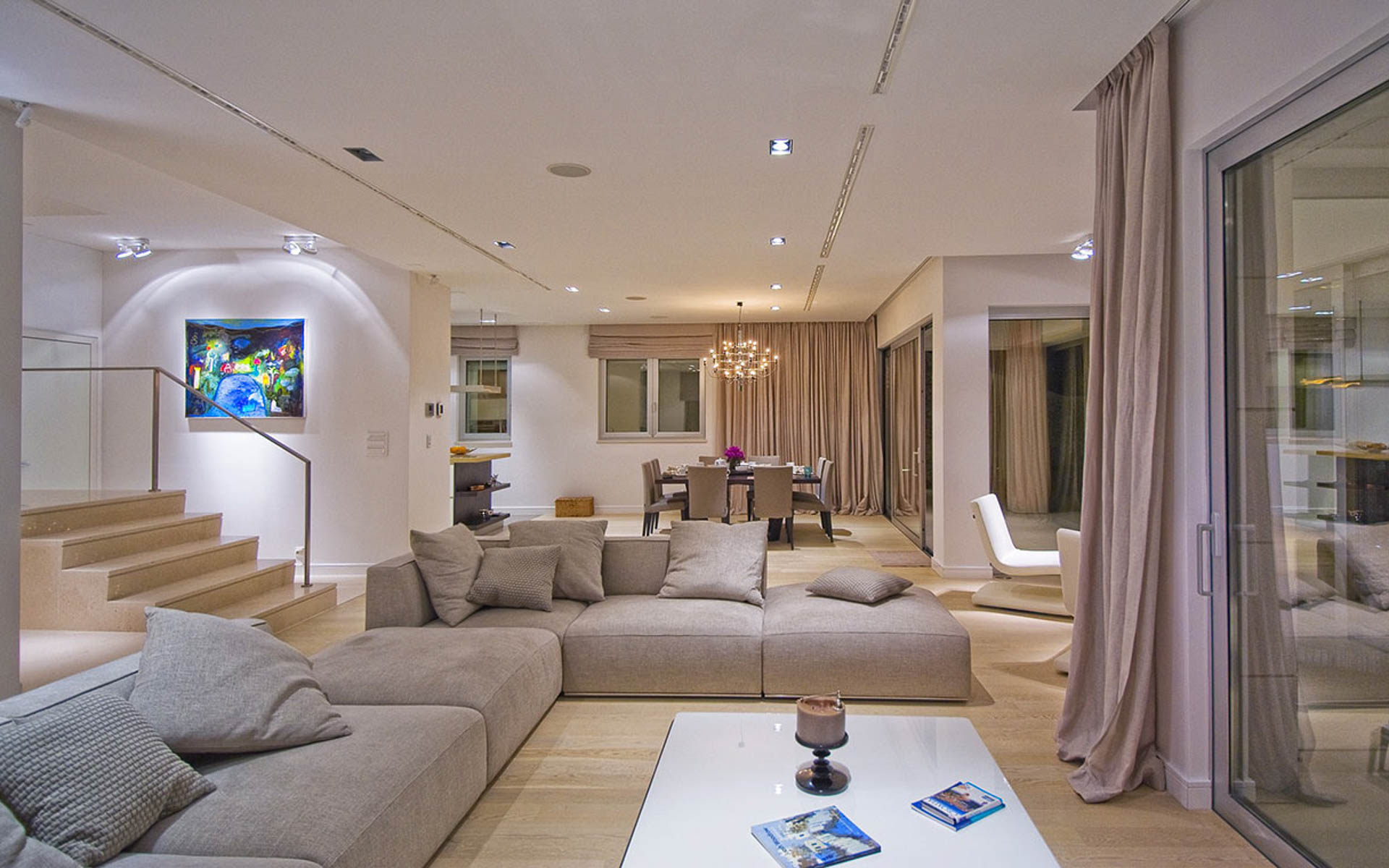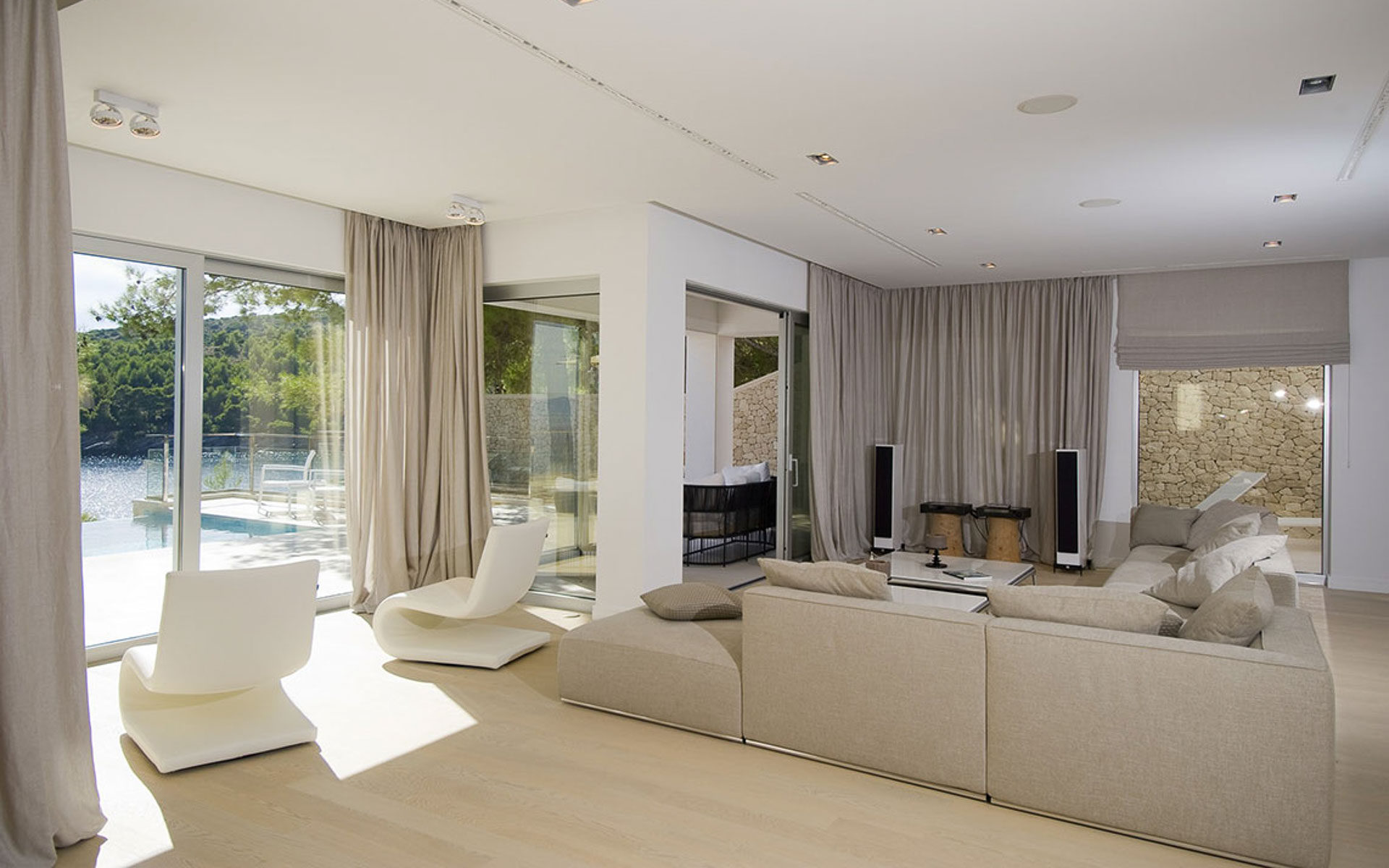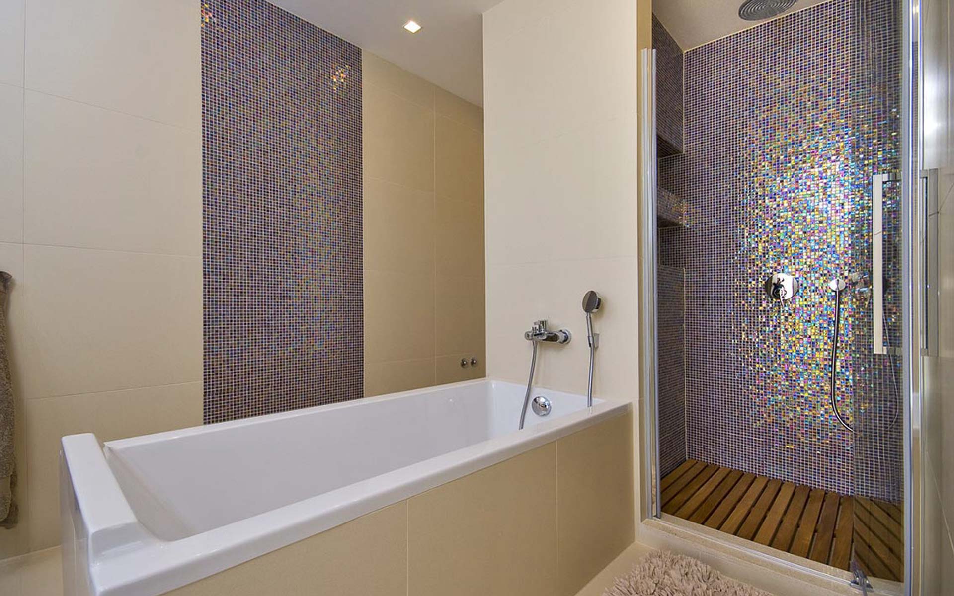 Inside, Villa Tiha is airy and modern, with open-plan living spaces and floor-to-ceiling glass doors that bring the outside in. The first floor offers two spacious en-suite bedrooms, each with private terraces, spa baths, and walk-in wardrobes. The top-floor master suite is a standout, with stunning sea views, while the fourth bedroom provides flexibility for guests or staff.